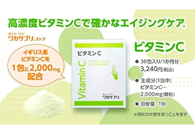 【ワカサプリ ビタミンC】エイジングケアにお薦めされている、1日2,000mgを1包に詰め込んでいます。毎日補うものだからこそ、使用しているビタミンCは、安全性が保証された工場でのみ製造しています。遺伝子組み換えでないトウモロコシから作られた、貴重なイギリス産のビタミンCを使用しています。トウモロコシなどの植物から、微生物などの力を借りながら作られた合成ビタミンCを利用したほぼ純粋なビタミンCなので、少ない量でたくさん補うことができます。